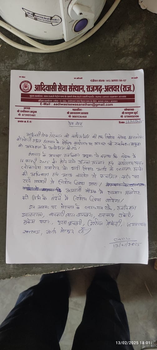 राजगढ़(अलवर)।आदिवासी सेवा संस्थान राजगढ़ -अलवर की कार्य समिति की एक विशेष बैठक मानसरोवर कॉलोनी राजगढ़ स्थित संस्थान के क्षेत्रीय कार्यालय पर अध्यक्ष रामकिशन आदुका की अध्यक्षता में आयोजित की गई।