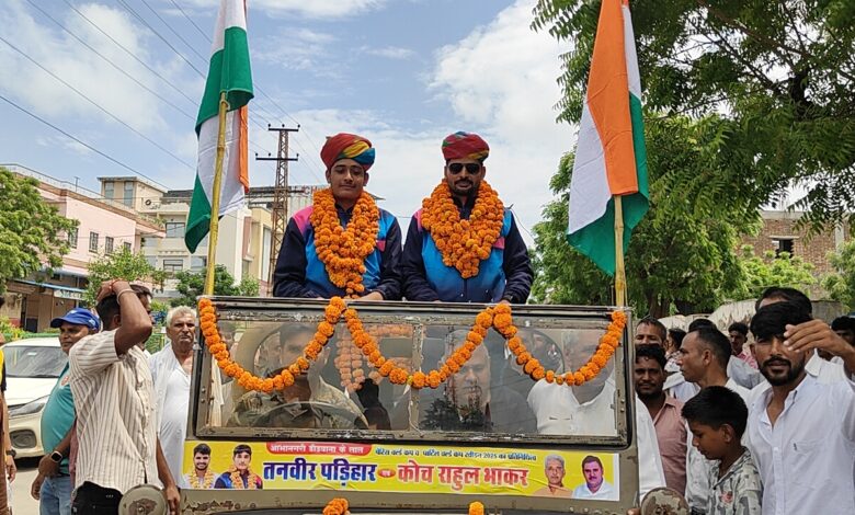 (हरिसिंह चौहान)डीडवाना जिला मुख्यालय पर स्थित मारवाड़ स्पोर्ट्स अकादमी के खिलाड़ी तनवीर पडीहार ने वह कारनामा कर दिखाया है। जो कारनामा आज का हर युवा खिलाड़ी करना चाहता है।तनवीर ने भारतीय टीम का नेतृत्व करते हुए,हैंडबॉल प्रतियोगिता में कांस्य पदक जीतकर डीडवाना का नाम रोशन किया है,तनवीर के कांस्य पदक जीतकर डीडवाना पहुंचने पर भव्य स्वागत किया गया है,और एक भव्य वाहन रैली का आयोजन भी किया गया है। वही मातृ शक्ति के द्वारा खिलाड़ी के डीडवाना पहुंचने पर मंगल गीत गाकर भी उनका स्वागत सत्कार किया गया।आप को बता दे कि पेरिस वर्ल्ड कप एवं पार्टिल वर्ल्ड कप स्वीडन 2025 में भारतीय हैंडबाल टीम का प्रतिनिधित्व कर लौटने पर खिलाड़ी तनवीर पड़िहार एव कोच राहुल भाकर का अस्पताल चौराहे पर जोरदार स्वागत किया गया।यह स्वागत मारवाड़ स्पोर्ट्स अकादमी के डॉक्टर सोहन चौधरी उनकी टीम के द्वारा किया गया,वहीं आमजन समाजसेवी भामाशाहों के द्वारा भी स्वागत किया गया। जिसमें योगेश लाल शर्मा भाजपा नेता श्याम प्रताप सिंह राठौड़ रामाकिशन खीचड़ के द्वारा भी तनवीर को माला साफा पहनाकर राहुल भाकर को माला पहनाकर स्वागत किया एवं उज्जवल भविष्य की शुभकामनाएं दी। वही स्वागत कार्यक्रम के पश्चात देशभक्ति गीतों के साथ में एक विशाल वाहन रैली का आयोजन भी किया गया।यह वाहन रैली अस्पताल चौराहे से आरंभ हुई।जहां कोच खिलाड़ी को ओपन जीप में बैठाकर भारत माता की जयकारों के साथ में रैली निकाली गई।जो रैली फवारा सर्किल बस स्टैंड चुंगी चौक की होते हुए रहमान गेट के पास जाकर संपूर्ण हुई,जहां पर एक सम्मान समारोह का आयोजन हुआ।एक बार फिर कोच खिलाड़ी एवं मारवाड़ स्पोर्ट अकादमी के डॉक्टर सोहन चौधरी का स्वागत अभिनंदन तनवीर के परिजनों के द्वारा किया गया।