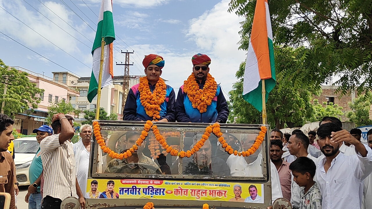 (हरिसिंह चौहान)डीडवाना जिला मुख्यालय पर स्थित मारवाड़ स्पोर्ट्स अकादमी के खिलाड़ी तनवीर पडीहार ने वह कारनामा कर दिखाया है। जो कारनामा आज का हर युवा खिलाड़ी करना चाहता है।तनवीर ने भारतीय टीम का नेतृत्व करते हुए,हैंडबॉल प्रतियोगिता में कांस्य पदक जीतकर डीडवाना का नाम रोशन किया है,तनवीर के कांस्य पदक जीतकर डीडवाना पहुंचने पर भव्य स्वागत किया गया है,और एक भव्य वाहन रैली का आयोजन भी किया गया है। वही मातृ शक्ति के द्वारा खिलाड़ी के डीडवाना पहुंचने पर मंगल गीत गाकर भी उनका स्वागत सत्कार किया गया।आप को बता दे कि पेरिस वर्ल्ड कप एवं पार्टिल वर्ल्ड कप स्वीडन 2025 में भारतीय हैंडबाल टीम का प्रतिनिधित्व कर लौटने पर खिलाड़ी तनवीर पड़िहार एव कोच राहुल भाकर का अस्पताल चौराहे पर जोरदार स्वागत किया गया।यह स्वागत मारवाड़ स्पोर्ट्स अकादमी के डॉक्टर सोहन चौधरी उनकी टीम के द्वारा किया गया,वहीं आमजन समाजसेवी भामाशाहों के द्वारा भी स्वागत किया गया। जिसमें योगेश लाल शर्मा भाजपा नेता श्याम प्रताप सिंह राठौड़ रामाकिशन खीचड़ के द्वारा भी तनवीर को माला साफा पहनाकर राहुल भाकर को माला पहनाकर स्वागत किया एवं उज्जवल भविष्य की शुभकामनाएं दी। वही स्वागत कार्यक्रम के पश्चात देशभक्ति गीतों के साथ में एक विशाल वाहन रैली का आयोजन भी किया गया।यह वाहन रैली अस्पताल चौराहे से आरंभ हुई।जहां कोच खिलाड़ी को ओपन जीप में बैठाकर भारत माता की जयकारों के साथ में रैली निकाली गई।जो रैली फवारा सर्किल बस स्टैंड चुंगी चौक की होते हुए रहमान गेट के पास जाकर संपूर्ण हुई,जहां पर एक सम्मान समारोह का आयोजन हुआ।एक बार फिर कोच खिलाड़ी एवं मारवाड़ स्पोर्ट अकादमी के डॉक्टर सोहन चौधरी का स्वागत अभिनंदन तनवीर के परिजनों के द्वारा किया गया।